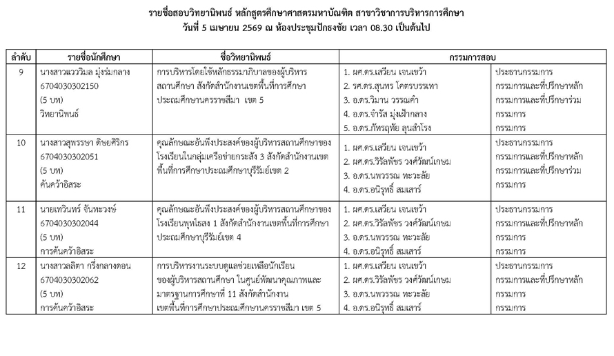 หัวข้อ : ประกาศรายชื่อสอบวิทยานิพนธ์ หลักสูตรศึกษาศาสตรมหาบัณฑิต สาชาวิชาการบริหารการศึกษา วันอาทิตย์ที่ 5 เมษายน 2569 ณ ห้องประชุมปักธงชัย เวลา 08.30 น. เป็นต้นไป